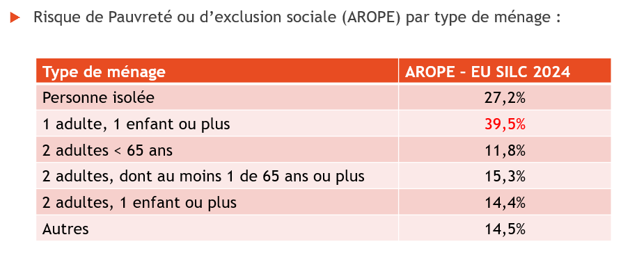 Les familles monoparentales courent le risque le plus élevé de pauvreté : 39,5%, contre 27,2% pour une personne isolée ou 14,4 % pour un ménage de deux adultes avec un ou plusieurs enfants.